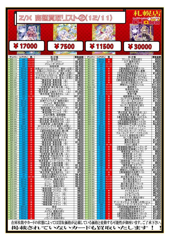 【Z/X】高額買取リスト(2019/12/11)