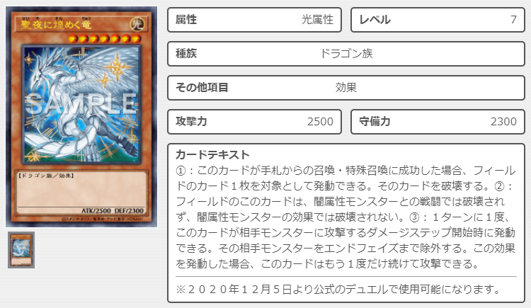 「聖夜に煌めく竜」とは異なり、効果を一切持ちませんが、逆に効果モンスターを指定した相手の効果を受けない利点もございます!!