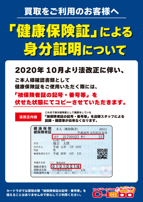 この度、2020年10月からの法改正に伴いまして、買取のご本人様確認書類として健康保険証をご使用の際には「被保険者証の記号・番号等」を伏せた状態でコピーさせていただきます。