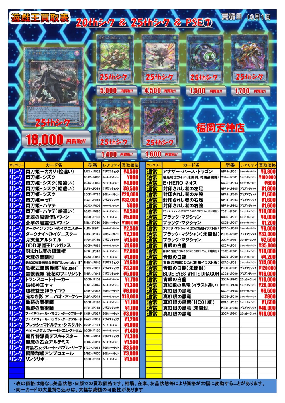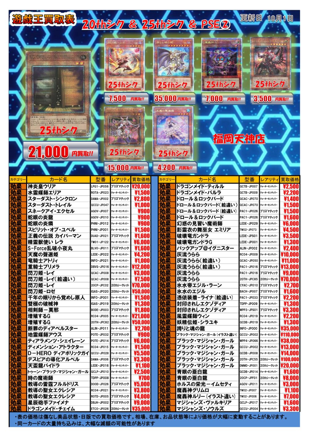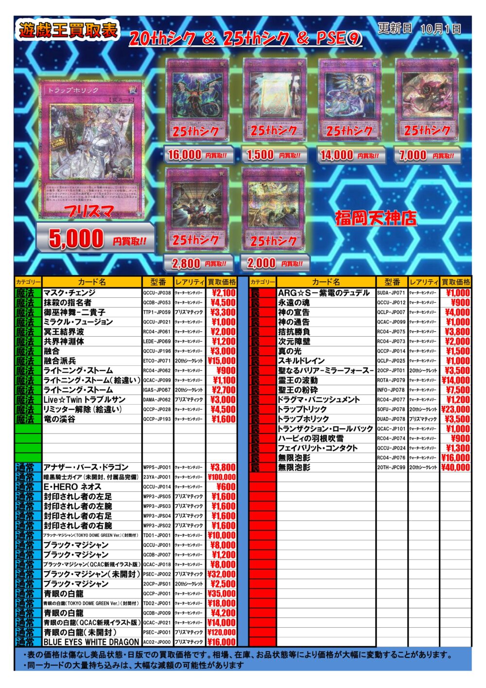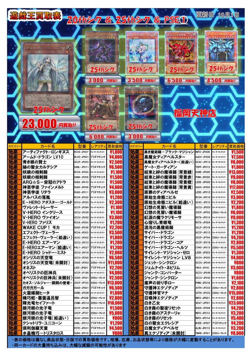 【福岡天神店】10月1日更新!遊戯王OCG 20th・プリズマ・25th買取表