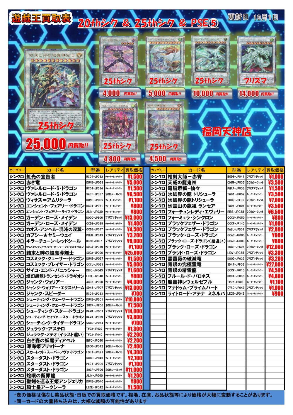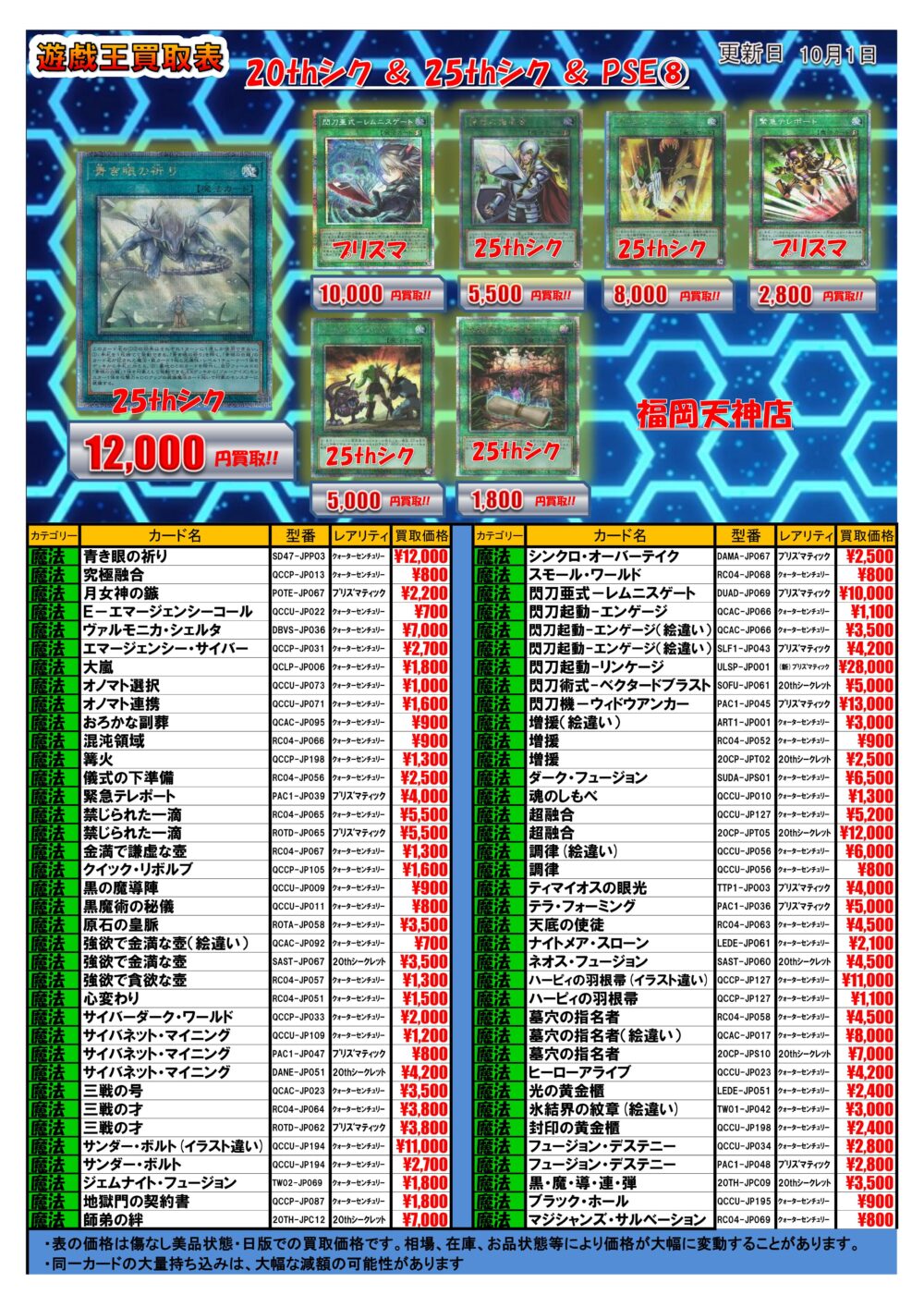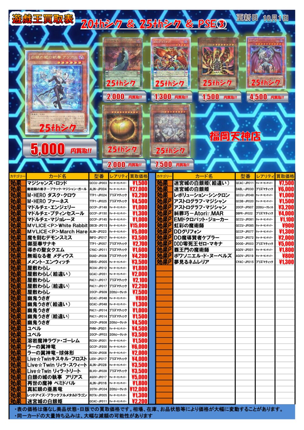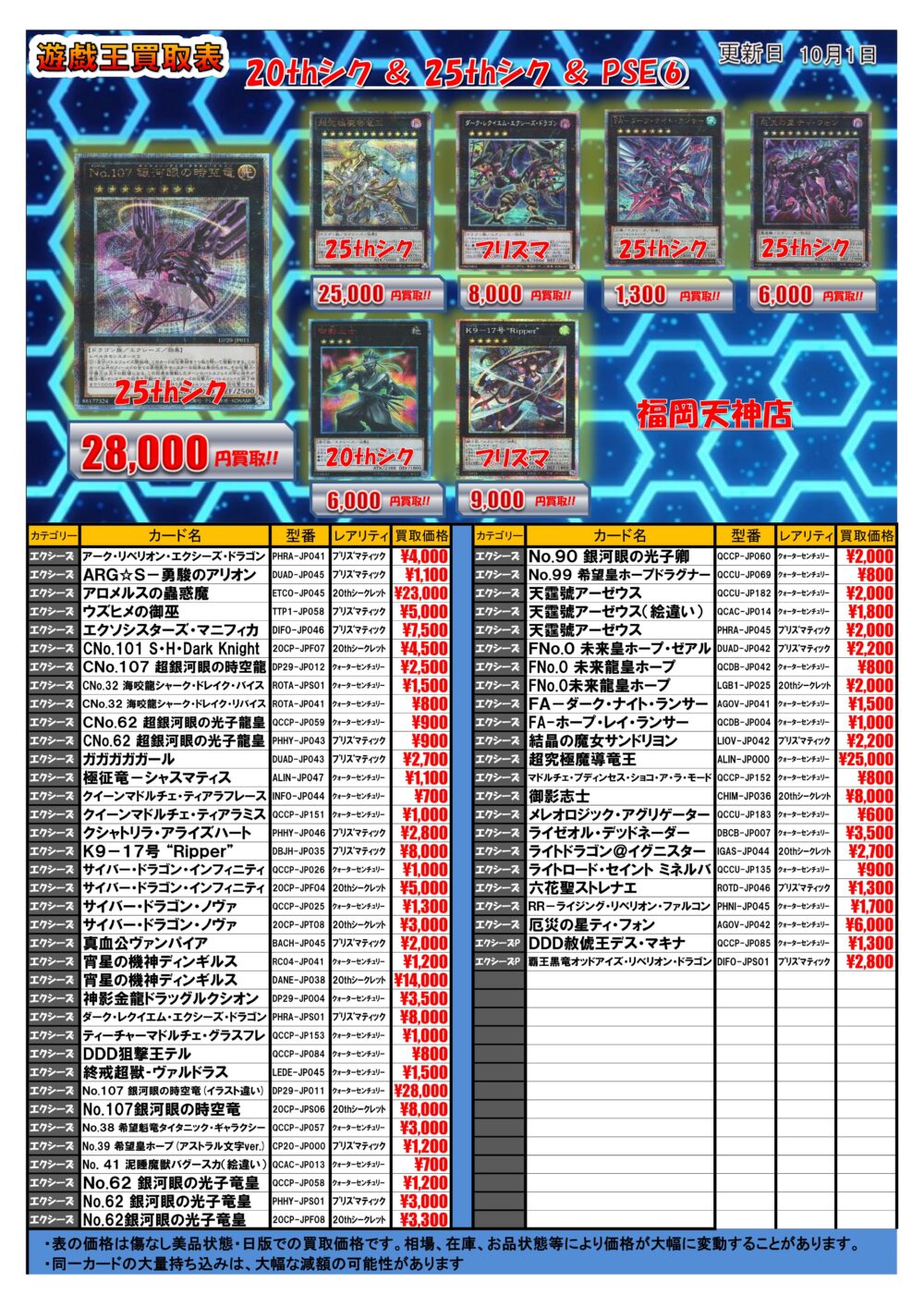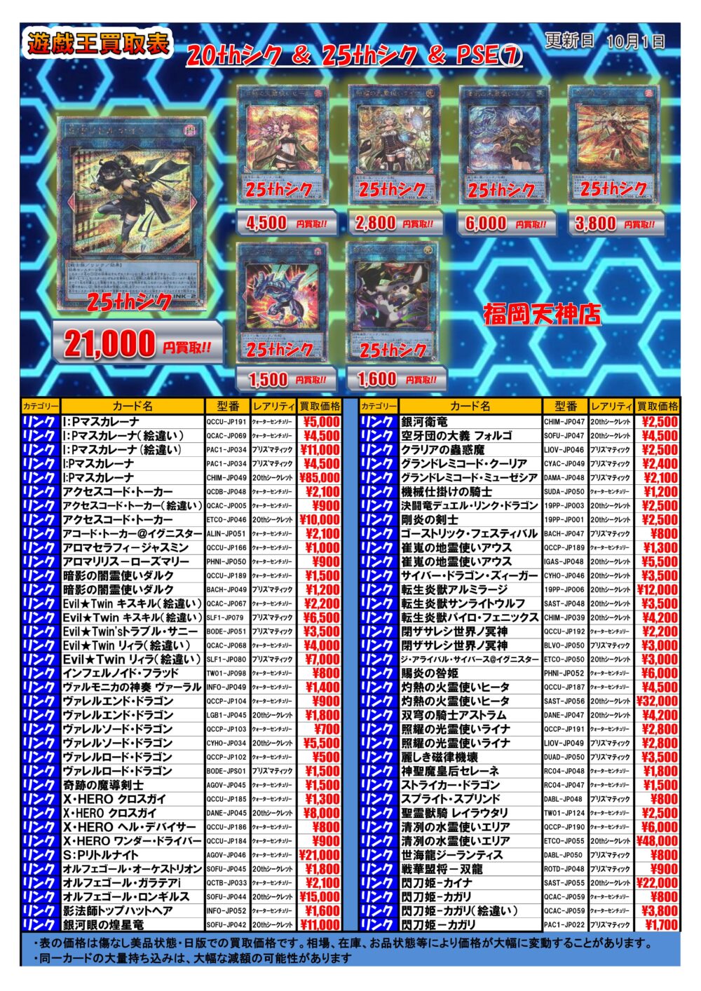 【福岡天神店】10月1日更新!遊戯王OCG 20th・プリズマ・25th買取表