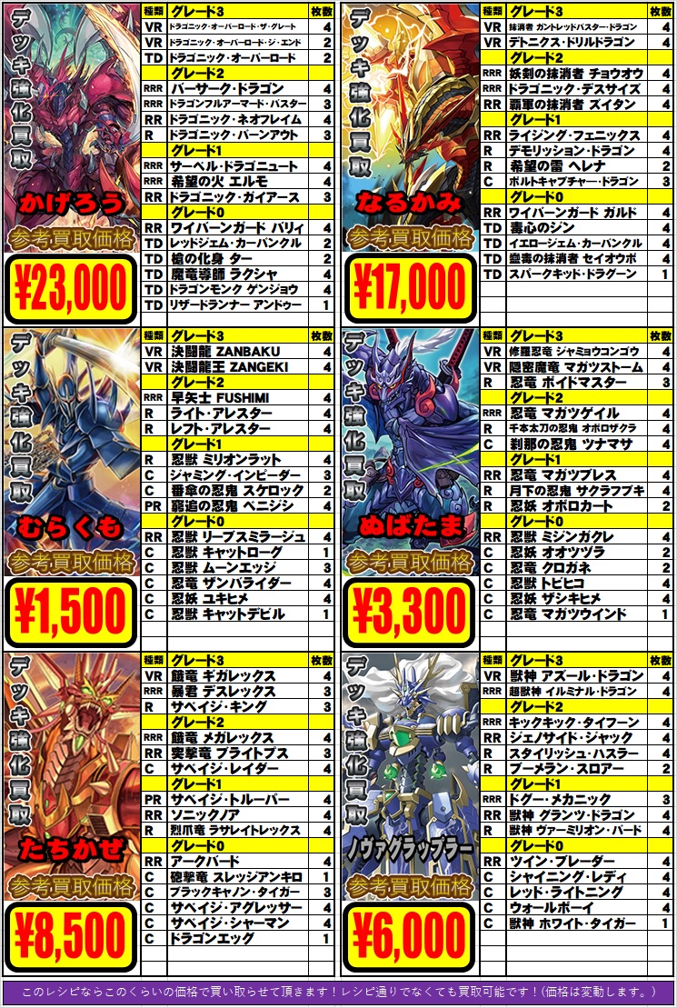 ↓デッキ買取表(レシピ通りなら表の価格で買い取ります!)