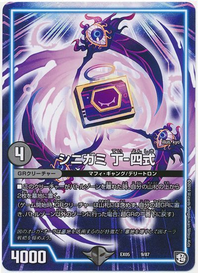 自分のターンの初めに墓地にあると、シールドを1枚削って墓地から出てきます、担当丸山が大好きなカード。零龍の墓地の儀を達成させたり、シールドのイワシンを落として手札交換したり、破壊の儀の巻き添えに使ったりとお仕事たくさんしてくれます。・・・ええ子や。