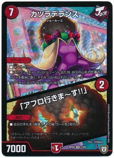 墓地のクリーチャーが6枚以上あれば0コストで出せるやばい奴。スピードアタッカー+パワーアタッカー100000+Wブレイカーという殺意の塊、昔から強かったなぁ・・・