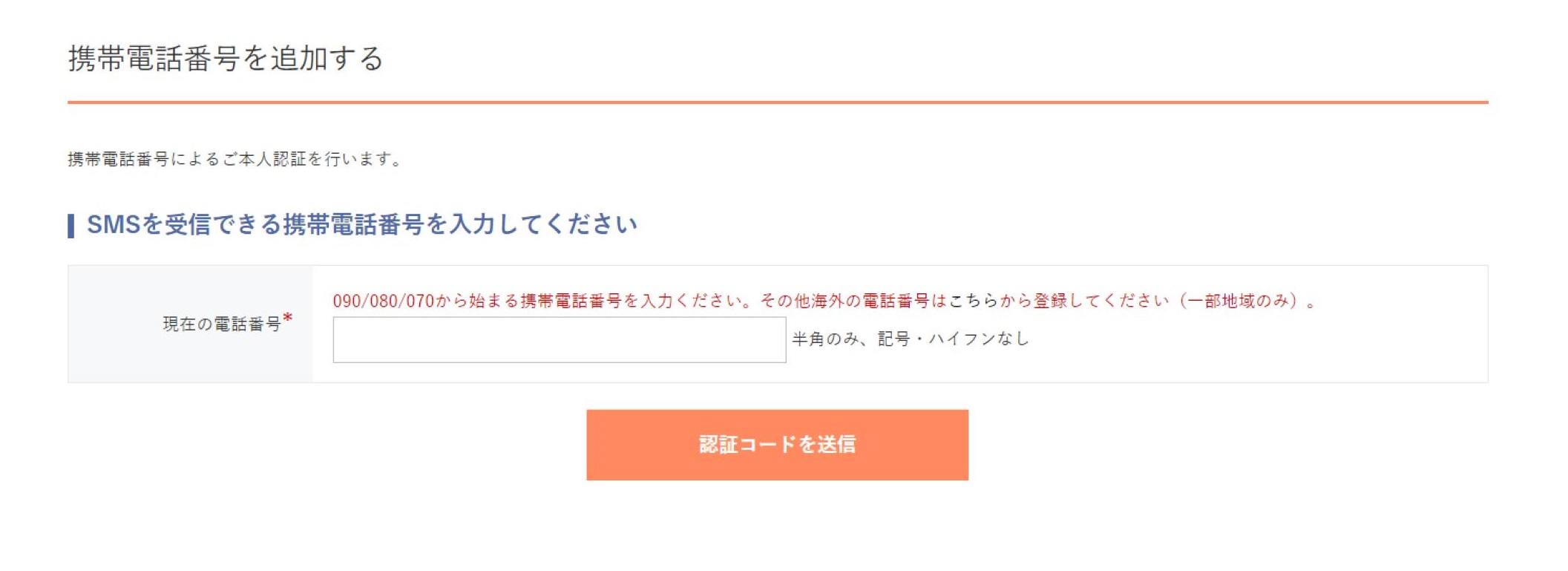 ④次に【SMSを受信できる携帯電話番号】を入力し、【認証コードを送信】をクリック