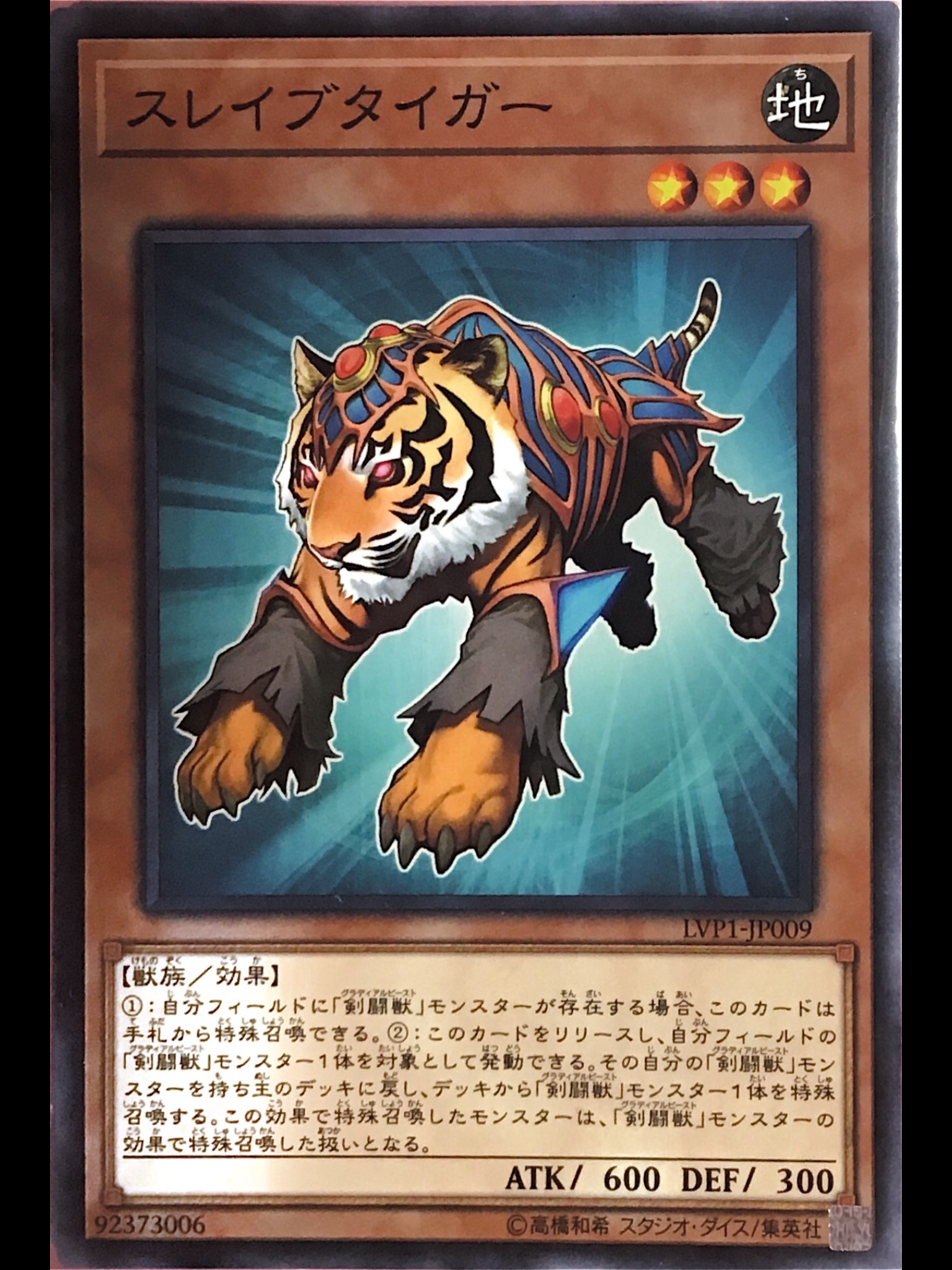 ・「剣闘獣」が存在すると「スレイブタイガー」が特殊召喚できます。「スレイブタイガー」を特殊召喚し、その効果②で「プリズマー」をデッキに戻して「剣闘獣ダリウス」を特殊召喚。